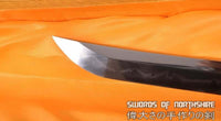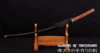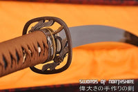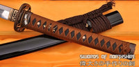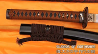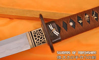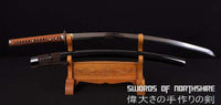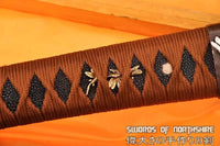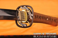 This Katana sword is made of 1095 high carbon steel, clay tempered with a polished mirror-like surface. It is a very strong blade made with traditional methods, for multiple applications. The blade is repeatedly heat treated and hand forged to remove impurities. The clay temper process combines the characters of toughness and flexibility and results in a genuine hamon (temper line). The blade is full tang and hand sharpened, suitable for battle. The sword comes with a black lacquered hardwood saya, silk sageo/ito, genuine same' (rayskin) and premium copper fittings. This sword is a very good choice for dojo and iaido use, gifts, cutting practice, display, and collection. It is durable enough for tameshigiri, bamboo, bones, and iron wire.