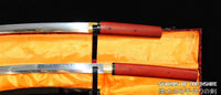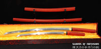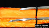 This shirasaya sword set is made of 1095 high carbon steel, clay tempered with a polished mirror-like surface. They are very strong swords made with traditional methods, for multiple applications. The blade is repeatedly heat treated and hand forged to remove impurities. The clay temper process combines the characters of toughness and flexibility and results in a genuine hamon (temper line). The blade is full tang and hand sharpened, suitable for battle. The swords come with a rosewood shirasaya style handle and saya with buffalo horn. The tang is secured with two mekugi and features a mei (signature). This sword is a very good choice for dojo and iaido use, gifts, cutting practice, display, and collection. It is durable enough for tameshigiri, bamboo, bones, iron wire, etc. This blade is a stunning combination of beauty and functionality.
