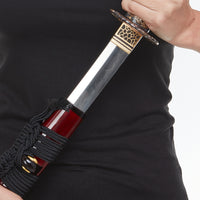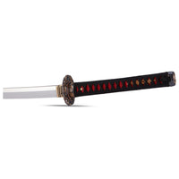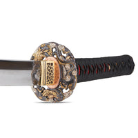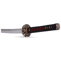 This sword is made of 1095 high carbon steel, clay tempered with a polished mirror-like surface. It is a very strong sword made with traditional methods, for multiple applications. The blade is repeatedly heat treated and hand forged to remove impurities. The clay temper process combines the characters of toughness and flexibility and results in a genuine hamon (temper line). The blade is full tang and hand sharpened, suitable for battle. The sword comes with silk sageo/ito, genuine same' (rayskin) and premium engraved copper fittings. The saya is made of hard wood, painted with multiple layers, hand carved with inlaid shells, and features buffalo horn at the ends. It's even more beautiful in person. This sword is a very good choice for dojo and iaido use, gifts, cutting practice, display, and collection. It is durable enough for tameshigiri, bamboo, bones, iron wire, etc. This blade is a stunning combination of beauty and functionality.