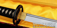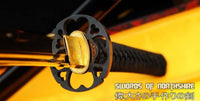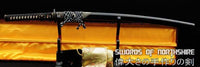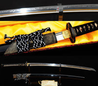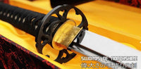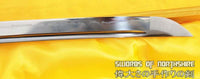 This sword is made of 1095 high carbon steel, clay tempered with a polished mirror-like surface. It is a very strong sword made with traditional methods, for multiple applications. The blade is repeatedly heat treated and hand forged to remove impurities. The clay temper process combines the characters of toughness and flexibility and results in a genuine hamon (temper line). The blade is full tang and hand sharpened, suitable for battle. The sword comes with silk sageo/ito, genuine same' (rayskin) and premium engraved copper fittings. The saya is made of hard wood and partially wrapped with genuine rayskin. This sword is a very good choice for dojo and iaido use, gifts, cutting practice, display, and collection. It is durable enough for tameshigiri, bamboo, bones, and iron wire.
