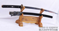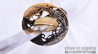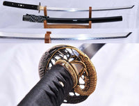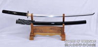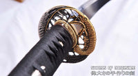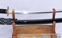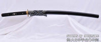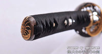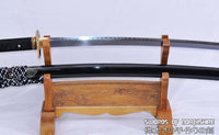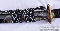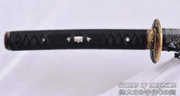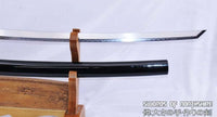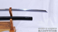 This sword is made of 1095 high carbon steel, clay tempered with a polished mirror-like surface. It is a very strong sword made with traditional methods, in the blade style of Kiriha Zukuri. The blade is repeatedly heat treated and hand forged to remove impurities. The clay temper process combines the characters of toughness and flexibility and results in a genuine hamon (temper line). The blade is full tang and hand sharpened, suitable for battle. The sword comes with a black lacquered hardwood saya with rayskin wrap, silk ito/sageo, genuine same' (rayskin) and premium copper fittings. It is a very good choice for dojo and iaido use, gifts, cutting practice, display, and collection. It is durable enough for tameshigiri, bamboo, bones, iron wire, etc. The cutting edge can be customize for different usage.