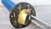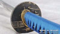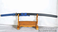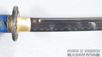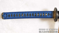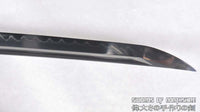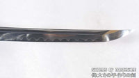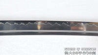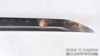 This sword is made of 1095 high carbon steel, clay tempered with a polished mirror-like surface. It is a very strong sword made with traditional methods. The kissaki (blade tip) length is far larger than the width, otherwise known as an o-kissaki. The blade is repeatedly heat treated and hand forged to remove impurities. The clay temper process combines the characters of toughness and flexibility and results in a genuine hamon (temper line). The blade is full tang and hand sharpened, suitable for battle. The sword comes with a black matte hardwood saya, silk ito/sageo, genuine same' (rayskin) and premium copper fittings. It is a very good choice for dojo and iaido use, gifts, cutting practice, display, and collection. It is durable enough for tameshigiri, bamboo, bones, and iron wire