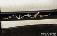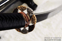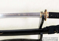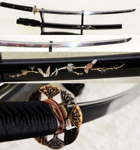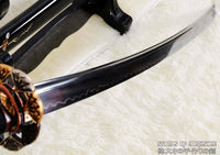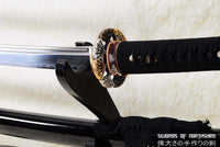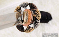 This sword is made of 1095 high carbon steel, clay tempered with a polished mirror-like surface. It is a very strong sword made with traditional methods, for multiple applications. The blade is repeatedly heat treated and hand forged to remove impurities. The clay temper process combines the characters of toughness and flexibility and results in a genuine hamon (temper line). The blade is full tang and hand sharpened, suitable for battle. The sword comes with silk sageo/ito, genuine same' (rayskin) and premium engraved copper fittings. The saya is made of hard wood, painted with multiple layers, hand carved and decorated with inlaid shells, and featured buffalo horn at the ends. This sword is a very good choice for dojo and iaido use, gifts, cutting practice, display, and collection. It is durable enough for tameshigiri, bamboo, bones, iron wire, etc. This blade is a stunning combination of beauty and functionality.