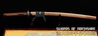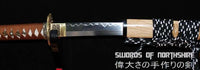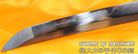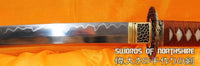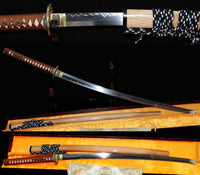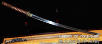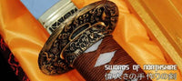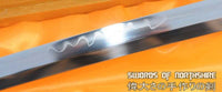 This sword is made of 1095 high carbon steel, clay tempered with a polished mirror-like surface. It is a very strong sword made with traditional methods, for multiple applications. The blade is repeatedly heat treated and hand forged to remove impurities. The clay temper process combines the characters of toughness and flexibility and results in a genuine hamon (temper line). The blade is full tang and hand sharpened, suitable for battle. The sword comes with a natural wood saya, silk sageo/ito, genuine same' (rayskin) and premium engraved copper fittings. It is a very good choice for dojo and iaido use, gifts, cutting practice, display, and collection. It is durable enough for tameshigiri, bamboo, bones, iron wire, etc. The cutting edge can be customize for different usage.