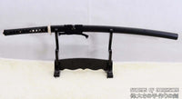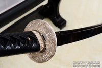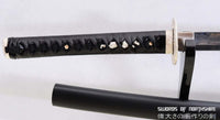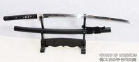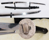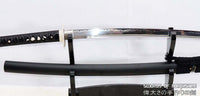 This sword is made of 1095 high carbon steel, clay tempered with a polished mirror-like surface. It is a very strong sword made with traditional methods. The blade is repeatedly heat treated and hand forged to remove impurities. The clay temper process combines the characters of toughness and flexibility and results in a genuine hamon (temper line). The blade is full tang and hand sharpened, suitable for battle. The sword comes with a black matte hardwood saya, black leather ito, silk sageo, genuine same' (rayskin) and premium copper fittings. It is a very good choice for dojo and iaido use, gifts, cutting practice, display, and collection. It is durable enough for tameshigiri, bamboo, bones, iron wire, etc. The cutting edge can be customize for different usage.
