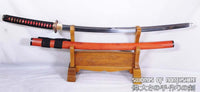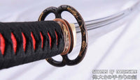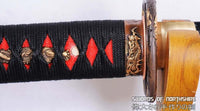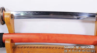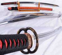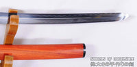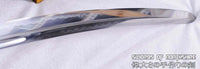 This Kogarasu Maru (Little Crow) sword is made of 1095 high carbon steel, clay tempered with a polished mirror-like surface. It is a very unique sword made in the style of unokubi-zukuri with two sharp edges. The blade is repeatedly heat treated and hand forged to remove impurities. The clay temper process combines the characters of toughness and flexibility and results in a genuine hamon (temper line) on both edges. The blade is full tang and hand sharpened, suitable for battle. The sword comes with a high quality rosewood saya with buffalo horn caps, silk sageo/ito, genuine same' (rayskin) and copper fittings. It is a very good choice for dojo and iaido use, gifts, cutting practice, display, and collection. It is durable enough for tameshigiri, bamboo, bones, and iron wire.