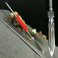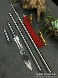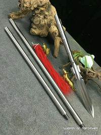 The Chinese Spear (Qiang) is used in many variations on the pre-modern Chinese battlefield. It is one of the four major weapons, called in this group "The King of Weapons". Many generals preferred the use of the spear because it's techniques and applications were superior to those of other weapons. Because the spear was normally light given it's great length it could be wielded with quickness and agility. This spear is a beautiful, fully functional replica of an ancient military weapon used only by elite Chinese troops. The leaf shaped blade is hand forged from 1095 high carbon steel and finished with a traditional 13 stage hand polished finish. The shaft is made from top quality stainless steel. The tassel shows elite troop status and also serves a tactical purpose. When the spear is moving quickly, the tassel aids in blurring the vision of the opponent. Qiang are generally used for long distance attacks, with fast and powerful lethality. This spear is very sharp and can be used for cutting or thrusting. Each spear has been fully handmade from the ground up, no two blades will be exactly alike.