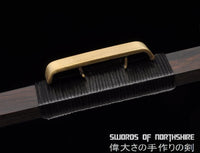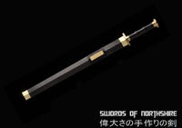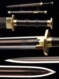 This battle ready Han Dynasty Jian sword is made of folded steel, designed to be perfect for practical Chinese martial arts training. The blade is heat-treated, tempered, and oil quenched to achieve optimal levels of durability and hardness. Traditional design with modern construction, this is not your average wushu sword. It is a weighty sword with a hand sharpened edge for practical use, or for serious collectors and Chinese history enthusiasts. It comes with an ebony wood scabbard and high quality plain copper fittings. The sword is great for tai chi, kung fu, wushu, cutting practice, and display. It's durable enough for tameshigiri and bamboo. Each sword is individually handmade so specifications vary slightly from sword to sword.