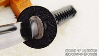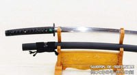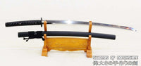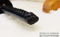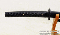 This sword is made of 1095 high carbon steel, clay tempered with a polished mirror-like surface. It is a very strong sword made with traditional methods, for multiple applications. The blade is repeatedly heat treated and hand forged to remove impurities. The clay temper process combines the characters of toughness and flexibility and results in a genuine hamon (temper line). The blade is full tang and hand sharpened, suitable for battle. The sword comes with a black matte hardwood saya, black leather ito, silk sageo, genuine same' (rayskin) and premium iron fittings. It is a very good choice for dojo and iaido use, gifts, cutting practice, display, and collection. It is durable enough for tameshigiri, bamboo, bones, iron wire, etc. The cutting edge can be customize for different usage.