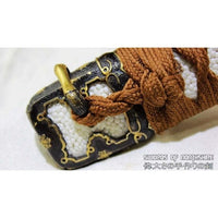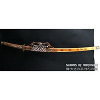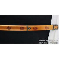 This tachi sword is made of 1095 high carbon steel, clay tempered with a polished mirror-like surface. It is a very strong sword made with traditional methods, for multiple applications. The blade is repeatedly heat treated and hand forged to remove impurities. The clay temper process combines the characters of toughness and flexibility and results in a genuine hamon (temper line). The blade is full tang and hand sharpened, suitable for battle. The sword comes with a high quality tachi saya, silk ito, genuine same' (rayskin) and premium copper fittings. The saya is made of hard wood, painted with multiple layers, and fitted with tachi koshirae. This sword is a very good choice for dojo and iaido use, gifts, cutting practice, display, and collection. It is durable enough for tameshigiri, bamboo, bones, iron wire, etc. It is a stunning combination of beauty and functionality.