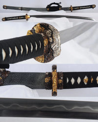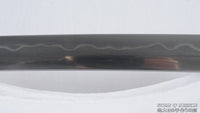 This tachi sword is made of 1095 high carbon steel, clay tempered & folded with a polished mirror-like surface and visible grain patterns. It is a very strong sword made with traditional methods, for multiple applications. The blade is repeatedly heat treated and hand forged to remove impurities. The clay temper process combines the characters of toughness and flexibility and results in a genuine hamon (temper line). The blade is full tang and hand sharpened, suitable for battle. The sword comes with a high quality full rayskin wrapped saya, silk ito, genuine same' (rayskin) and beautiful premium copper fittings. This sword is a very good choice for dojo and iaido use, gifts, cutting practice, display, and collection. It is durable enough for tameshigiri, bamboo, bones, iron wire, etc. It is a stunning combination of beauty and functionality.