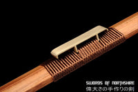 This battle ready Han Dynasty Jian sword is made of damascus steel, clay tempered with a genuine hamon on both edges, designed to be perfectly balanced for practical Chinese martial arts training. The blade is heat-treated, clay tempered, and quenched to achieve optimal levels of durability and hardness. Traditional design with modern construction, this is not your average wushu sword. It is a weighty sword with a hand sharpened edge for practical use, or for serious collectors and Chinese history enthusiasts. It comes with a huali wood scabbard, cord wrapped handle, and minimalist brass fittings. The mouth of the scabbard fits the v-shaped guard immaculately. The sword is great for tai chi, kung fu, wushu, cutting practice, and display. It's durable enough for tameshigiri and bamboo. Each sword is fully handmade from the ground up, no two swords will be exactly alike.