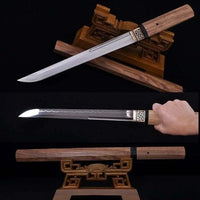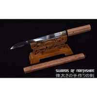 This high quality tanto shirasaya is made of 1095 high carbon steel, clay tempered with a polished mirror-like surface. It is a very strong blade made with traditional methods, for multiple applications. The blade is repeatedly heat treated and hand forged to remove impurities. The clay temper process combines the characters of toughness and flexibility and results in a genuine hamon (temper line). The blade is full tang and hand sharpened, suitable for battle. The sword comes with a natural huali wood saya with matching tsuka. This sword is a very good choice for dojo and iaido use, gifts, cutting practice, display, and collection. It is durable enough for tameshigiri, bamboo, bones, and iron wire.