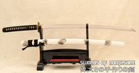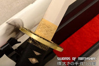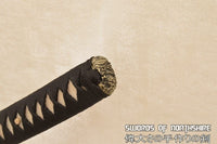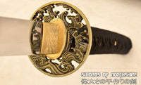 This Katana is made of 9260 Spring Steel which can withstand a high degree of bending and still spring back true. The blade has great durability and also better resistance to abrasion and corrosion than other high carbon steel blades. The blade is full tang and hand sharpened, suitable for battle. The sword comes with silk ito and sageo, genuine rayskin, alloy fittings, painted hardwood saya, and engraved brass habaki. This sword is a very good choice for dojo and iaido use, gifts, cutting practice, display, and collection. It is durable enough for cutting tatami mats and bamboo. Each sword is fully handmade from the ground up, no two blades will be exactly alike.