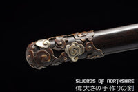 This battle ready Jian sword is made of folded steel, designed to be perfect for practical Chinese martial arts training. The blade is heat-treated, tempered, and oil quenched to achieve optimal levels of durability and hardness. Traditional design with modern construction, this is not your average wushu sword. It is a weighty sword with a hand sharpened edge for practical use, or for serious collectors and Chinese history enthusiasts. It comes with an ebony wood scabbard, matching handle, and high quality copper fittings. The sword is great for tai chi, kung fu, wushu, cutting practice, and display. It's durable enough for tameshigiri and bamboo. Each sword is individually handmade so specifications vary slightly from sword to sword.