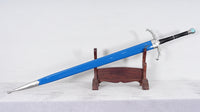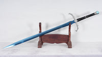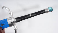 Our replica of Brisingr from the Eragon movie is sure to stun with its signature blue gem handle and scabbard. It is known for its creation by the famous elven smith Rhunön, who created it by controlling Eragon’s body to craft. The faux blue sapphire on the end of the handle completes the blade, as well as the horned appearance of the handguard, paying homage to the dragon of Eragon, Saphira. The blade bears the engraving "Brisingr", as the glyph for "Fire" in the ancient language. This blade is colored blue via acid oxidation, and the black handle wrapping makes this sword a perfectly accurate replica.