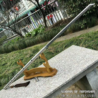 When sheathed, the sword looks like a flute. Unsheathed, it's a 62cm Kiriha-Zukuri straight sword. But it serves yet another purpose. When you screw the flute scabbard on to the opposite end of the handle it becomes a light-weight spear with a total length of 115cm. This flute sword is hand forged from heat-treated and tempered 1095 high carbon steel, featuring a special blade treatment with beautiful carved patterns. This is not only aesthetically pleasing, but it also helps prevent corrosion. The scabbard is made of stainless steel and serves as an 8-hole flute, it includes the pictured tassel. It can be used for real combat, cutting, and self defense. Please note, it doesn't function as a real flute.