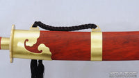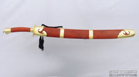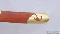 This battle ready dao sword is made of folded steel, designed to be perfect for practical Chinese martial arts training. The blade is heat-treated, tempered, and oil quenched to achieve optimal levels of durability and hardness. The blade is thick, powerful, and full tang. Traditional design with modern construction, this is not your average wushu sword. It is a weighty sword with a hand sharpened edge for practical use, or for serious collectors and Chinese history enthusiasts. It comes with a rosewood scabbard, matching handle, and high quality brass fittings. The full tang is secured into the handle with two bamboo pegs. The sword is great for tai chi, kung fu, wushu, cutting practice, and display. It's durable enough for tameshigiri and bamboo. Each sword is individually handmade so specifications vary slightly from sword to sword.