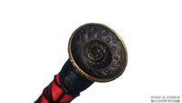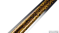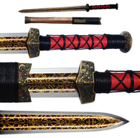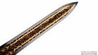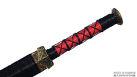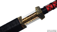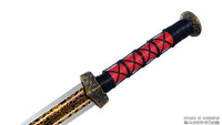 This battle ready Han Jian sword is made of folded steel. The middle portion of the blade is engraved and painted with a mixture of laquer and gold-colored powder to give it an elegant and striking design. The sword is made to be perfect for practical Chinese martial arts training. The blade is heat-treated, tempered, and oil quenched to achieve optimal levels of durability and hardness. Traditional design with modern construction, this is not your average wushu sword. It is a weighty sword with a hand sharpened edge for practical use, or for serious collectors and Chinese history enthusiasts. It comes with an huali wood scabbard, matching handle, and high quality brass fittings. The sword is great for tai chi, kung fu, wushu, cutting practice, and display. It's durable enough for tameshigiri and bamboo. Each sword is individually handmade so specifications vary slightly from sword to sword.