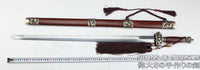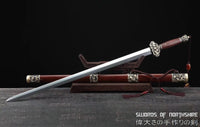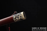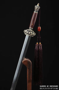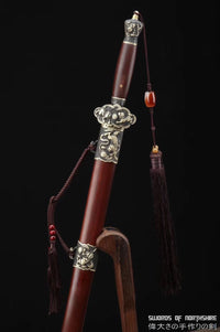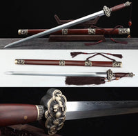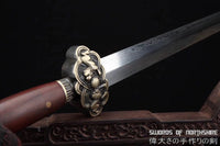This battle ready Foo Dog Jian sword is made of folded damascus steel, designed to be perfect for practical Chinese martial arts training. The blade is heat-treated, folded, tempered, and oil quenched to achieve optimal levels of durability and hardness. Traditional design with modern construction, this is not your average wushu sword. It is a weighty sword with a hand sharpened edge for practical use, or for serious collectors and Chinese history enthusiasts. It comes with a high quality rosewood scabbard, matching handle with a beautiful tassel, and high quality carved brass fittings. The sword is great for tai chi, kung fu, wushu, cutting practice, and display. It's durable enough for tameshigiri and bamboo. Each sword is fully handmade from the ground up, no two swords will be exactly alike.