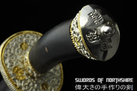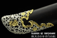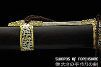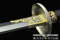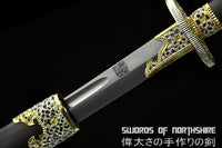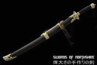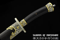 This battle ready dao sword is made of folded steel, designed to be perfect for practical Chinese martial arts training. The blade is heat-treated, tempered, and oil quenched to achieve optimal levels of durability and hardness. The blade is thick, powerful, and full tang. Traditional design with modern construction, this is not your average wushu sword. It is a weighty sword with a hand sharpened edge for practical use, or for serious collectors and Chinese history enthusiasts. It comes with an ebony wood scabbard, matching handle, and high quality engraved copper fittings plated with gold and silver. The sword is great for tai chi, kung fu, wushu, cutting practice, and display. It's durable enough for tameshigiri and bamboo. Each sword is individually handmade so specifications vary slightly from sword to sword.