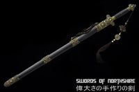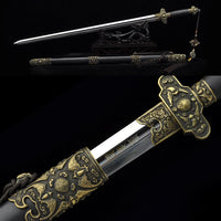 This battle ready Jian sword is made of folded steel, designed to be perfect for practical Chinese martial arts training. The blade is heat-treated, tempered, and oil quenched to achieve optimal levels of durability and hardness. Traditional design with modern construction, this is not your average wushu sword. It is a weighty sword with a hand sharpened edge for practical use, or for serious collectors and Chinese history enthusiasts. It comes with an ebony wood scabbard, matching handle, and high quality copper fittings. The sword is great for tai chi, kung fu, wushu, cutting practice, and display. It's durable enough for tameshigiri and bamboo. Each sword is individually handmade so specifications vary slightly from sword to sword.