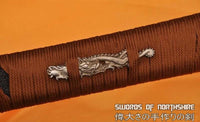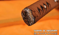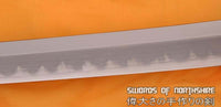 This Gyaku-Kobuse Katana is constructed with two different kinds of steel, folded steel (8,192 layers) on the outside, and 1095 high carbon steel making the core and cutting edge. The visible undulating grain pattern on the blade is a result from folding the steel 13 times during forging. The blade is completely polished with Hazuya which is a very thin Uchigumori stone. The Hazuya is used to bring out the beautiful cloudy hamon (temper line). The blade is repeatedly heat treated and hand forged to remove impurities. The clay temper process combines the characters of toughness and flexibility and results in a genuine hamon (temper line) which is enhanced by the Hazuya stone. The blade is full tang and hand sharpened, suitable for battle. The sword comes with a high quality carved black hardwood saya with piano finish, silk sageo/ito, premium brass fittings, and genuine same (rayskin). This sword is a very good choice for dojo and iaido use, gifts, cutting practice, display, and collection. It is durable enough for tameshigiri, bamboo, bones, and iron wire.