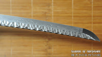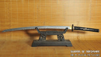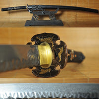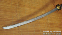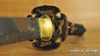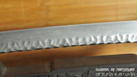 This unique blade is sure to catch the eye of any collector. The spine is forged in a way to purposefully create this uneven blade style, which is rare to find in any other blades. This blade comes with a custom menuki, and the copper fittings work well with the genuine black rayskin wrap to tie together this beautiful piece. It is a very good choice for Dojo students, gifts, cutting practice, and display. The sword is durable enough for tameshigiri and bamboo. Each sword is individually handmade so specifications vary slightly from sword to sword.