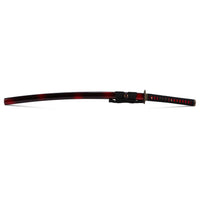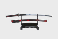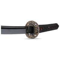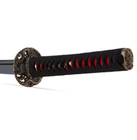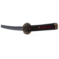 This Katana sword is hand forged and hand sharpened using Japanese methods to create the perfect blade for iaido and kenjutsu use. The blade is heat-treated, tempered, and oil quenched to achieve optimal levels of flexibility and hardness. The blade is then hand polished with multiple grades of sharpening stones. After sharpening, the blade is etched with an oxidation process to give the surface it's black color. It comes with a black and red lacquered hard wood saya and silk sageo/ito, solid alloy fittings, and genuine same (rayskin). The full tang is secured into the handle with two bamboo mekugi. It is a very good choice for Dojo students, gifts, cutting practice, and display. The sword is durable enough for tameshigiri and bamboo. Each sword is individually handmade so specifications vary slightly from sword to sword.