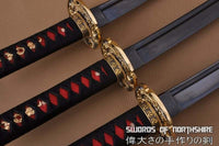 This samurai sword set offers great quality at a reasonable price. Featuring our hand forged and polished 1060 carbon steel blade, designed for optimal balance and handling. This is a more traditional alternative to the many zinc aluminum alloy blades available. Our steel blades have been designed from the ground up, to offer perfect balance for regular Iaido & Kenjutsu use. After sharpening, the blade is etched with an oxidation process to give the surface it's black color. The swords come equipped with a black and red lacquered hardwood saya, silk sageo/ito, alloy fittings, genuine same' (rayskin) and silk wrapped tsuka (handle). The swords are well assembled and the ito wrapping is tight and even. Each sword is individually handmade so specifications may vary slightly.