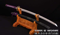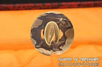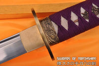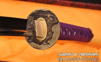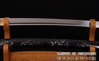 This Katana sword is hand forged and hand sharpened using Japanese methods to create the perfect blade for iaido and kenjutsu use. The blade is heat-treated, tempered, and oil quenched to achieve optimal levels of flexibility and hardness. Finally, the blade is hand polished with multiple grades of sharpening stones which makes the surface of the blade reflective like a mirror. It comes with a black lacquered and painted hardwood saya, silk sageo/ito, premium brass fittings, and genuine same (rayskin). The full tang is secured into the handle with two bamboo mekugi. It is a very good choice for Dojo students, gifts, cutting practice, and display. The sword is durable enough for tameshigiri and bamboo. Each sword is individually handmade so specifications vary slightly from sword to sword.