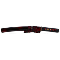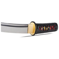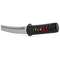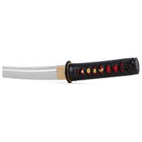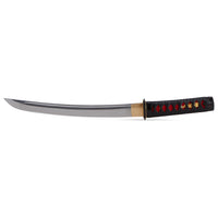 This Tanto sword is hand forged and hand sharpened using Japanese methods to create the perfect blade for iaido and kenjutsu use. The blade is heat-treated, tempered, and oil quenched to achieve optimal levels of flexibility and hardness. Finally, the blade is hand polished with multiple grades of sharpening stones which makes the surface of the blade reflective like a mirror. It comes with a black and red lacquered hard wood saya and silk sageo, synthetic leather ito, premium iron fittings, and genuine same (rayskin). The full tang is secured into the handle with two bamboo mekugi. It is a very good choice for Dojo students, gifts, cutting practice, and display. The sword is durable enough for tameshigiri. Each sword is individually handmade so specifications vary slightly from sword to sword.