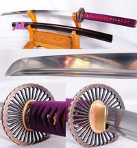 This Katana offers great quality at a reasonable price. Featuring our hand forged and polished 1060 carbon steel blade, designed for optimal balance and handling. This sword is a more traditional alternative to the many zinc aluminum alloy blades available. Our steel blades have been designed from the ground up, to offer perfect balance for regular Iaido & Kenjutsu use. The sword comes equipped with a dark red lacquered hardwood saya, silk sageo/ito, alloy fittings, genuine same' (rayskin) and silk wrapped tsuka (handle). The Katana is well assembled and the ito wrapping is tight and even. Each sword is individually handmade so specifications may vary slightly.