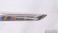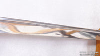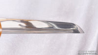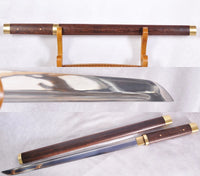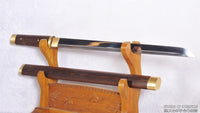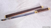 This is a well-made 1060 high carbon steel Shirasaya that is heat-treated, tempered, and oil quenched to achieve optimal levels of flexibility and hardness. The blade is hand polished with multiple grades of sharpening stones which makes the surface of the blade reflective. It comes with a natural huali wood saya with matching handle and brass fittings. The full tang is secured into the handle with two bamboo mekugi pegs. The sword is strong enough to cut through bamboo yet sharp enough to slice paper. Each sword is individually handmade so specifications vary slightly from sword to sword.