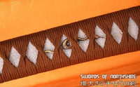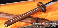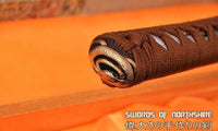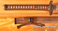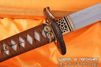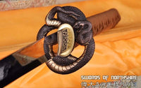 The Serpent Katana sword is made of 1095 high carbon steel, clay tempered with a polished mirror-like surface. It is a very strong blade made with traditional methods, for multiple applications. The blade is repeatedly heat treated and hand forged to remove impurities. The clay temper process combines the characters of toughness and flexibility and results in a genuine hamon (temper line). The blade is full tang and hand sharpened, suitable for battle. The sword comes with a natural huali wood saya, silk sageo/ito, genuine same' (rayskin) and premium engraved copper fittings. This sword is a very good choice for dojo and iaido use, gifts, cutting practice, display, and collection. It is durable enough for tameshigiri, bamboo, bones, and iron wire.