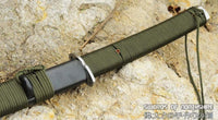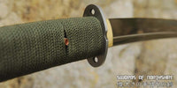 The tactical wakizashi from Swords of Northshire is specially designed for outdoor survival. It’s a plain, but functional piece that is hand forged by our master craftsmen. We recommend this blade for outdoor activities such as hunting, hiking, jungle adventures, and field survival. The dark green handle wrappings and matte black sheath are subtle and easy to camouflage in the woods, while the high carbon steel and full tang blade are fully functional and can cut wood, bone, iron wire, and more.