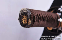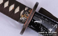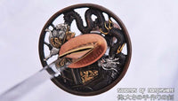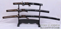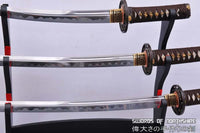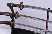 The blade is Unokubi-Zukuri style, with a back that gets thinner around the middle of the blade and regains its thickness just before the point. It's made of through hardened 1095 high carbon steel. The blade was repeatedly heat treated and hand forged to remove impurities, which gives it strength and flexibility. The blade is full tang with hand engraved Mei (Signature). It is fully functional and battle ready. The swords come with a black lacquered and painted hardwood saya, silk sageo/ito, premium copper fittings, and genuine rayskin. It is suitable for dojo and iaito use, gifts, cutting practice, and display. It is durable enough for cutting tameshigiri, bamboo, bones, and iron wire.