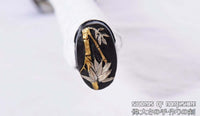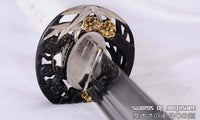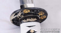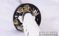 In addition to the traditional design of the blade, we’ve also accented this weapon with classic Japanese themes. The blossoms and bamboo on the hilt — picked out in silver and gold plating — add delicate artistry to such a brutal weapon.