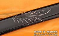 This is a well-made colorful folded steel sword, following the traditional Japanese process. The blade is very sharp and folded 13 times resulting in over 8,000 layers. After sharpening, the blade is etched with an oxidation process to give the surface it's black and red color. It comes with a black lacquered hardwood saya with hand carving, solid alloy fittings, and genuine same (rayskin). The tang is secured into the handle with two bamboo mekugi. It is a very good choice for Dojo students, gifts, cutting practice, and display. It is durable enough for cutting tameshigiri and bamboo. Each sword is individually handmade so specifications vary slightly from sword to sword.