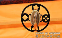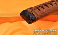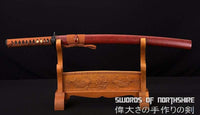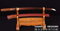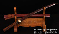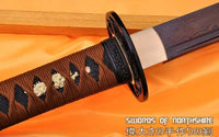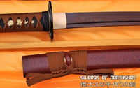This is a well-made colorful folded steel sword, following the traditional Japanese process. The blade is very sharp and folded 13 times resulting in over 8,000 layers. After sharpening, the blade is etched with an oxidation process to give the surface it's black and red color. It comes with a black and red hard wood saya and silk sageo/ito, iron fittings, and genuine same (rayskin). The tang is secured into the handle with two bamboo mekugi. It is a very good choice for Dojo students, gifts, cutting practice, and display. It is durable enough for cutting tameshigiri and bamboo. Each sword is individually handmade so specifications vary slightly from sword to sword.
