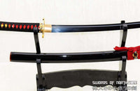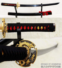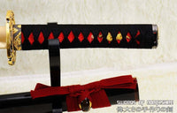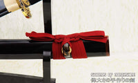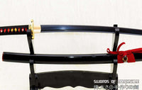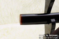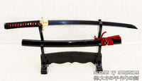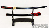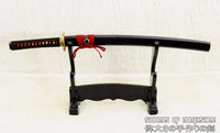 This is a well-made colorful folded steel sword, following the traditional Japanese process. The blade is very sharp and folded 13 times resulting in over 8,000 layers. After sharpening, the blade is etched with an oxidation process to give the surface it's black color. It comes with a black lacquered hard wood saya with buffalo horn, silk sageo/ito, alloy fittings, and genuine same (rayskin). The tang is secured into the handle with two bamboo mekugi. It is a very good choice for Dojo students, gifts, cutting practice, and display. It is durable enough for cutting tameshigiri and bamboo. Each sword is individually handmade so specifications vary slightly from sword to sword.