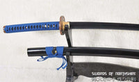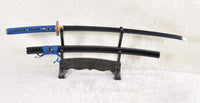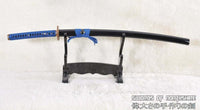 This is a well-made colorful folded steel sword, following the traditional Japanese process. The blade is very sharp and folded 13 times resulting in over 8,000 layers. After sharpening, the blade is etched with an oxidation process to give the surface it's black color. It comes with a black lacquered hard wood saya and silk sageo/ito, copper fittings, and genuine same (rayskin). The tang is secured into the handle with two bamboo mekugi. It is a very good choice for Dojo students, gifts, cutting practice, and display. It is durable enough for cutting tameshigiri and bamboo. Each sword is individually handmade so specifications vary slightly from sword to sword.