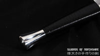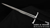 Another of our new sword designs is this beautiful piece with a medieval European design. The blade is made of folded 1095 high carbon steel polished to bring out it's beautiful grain pattern. It features a sleek iron handguard and pommel, and the hardwood handle is wrapped in black leather cord. This blade is solidly built and full tang, ready to be taken into battle. It can be used for cutting thick bamboo, bone, and iron wire.