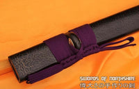 This is a well-made folded steel Katana, following the traditional Japanese process. The blade is very sharp and folded 13 times resulting in 8,192 layers. The visible grain pattern on the blade comes from folding the blade repeatedly during forging. The blade is then heat-treated, tempered, and oil quenched to achieve optimal levels of flexibility and hardness. Finally, the blade is hand polished with multiple grades of sharpening stones which makes the surface of the blade reflective like a mirror. It comes with a black hardwood saya with crackle design, premium brass fittings, and genuine same (rayskin). The full tang is secured into the handle with two bamboo mekugi. It is a very good choice for Dojo students, gifts, cutting practice, and display. The sword is strong enough to cut through bamboo yet sharp enough to slice paper. Each sword is individually handmade so specifications vary slightly from sword to sword.