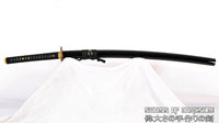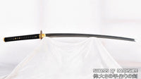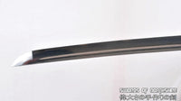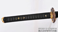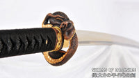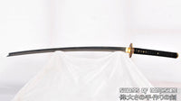 This is a well-made folded steel Katana, following the traditional Japanese process. The blade is very sharp and folded 13 times resulting in 8,192 layers. The visible grain pattern on the blade comes from folding the blade repeatedly during forging. The blade is then heat-treated, tempered, and oil quenched to achieve optimal levels of flexibility and hardness. Finally, the blade is hand polished with multiple grades of sharpening stones which makes the surface of the blade reflective like a mirror. It comes with a black lacquered hard wood saya and silk sageo/ito, premium copper fittings, and genuine same (rayskin). The full tang is secured into the handle with two bamboo mekugi. It is a very good choice for Dojo students, gifts, cutting practice, and display. The sword is strong enough to cut through bamboo yet sharp enough to slice paper. Each sword is individually handmade so specifications vary slightly from sword to sword.