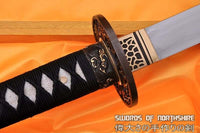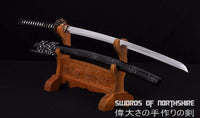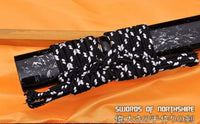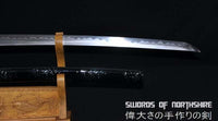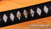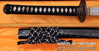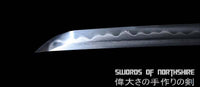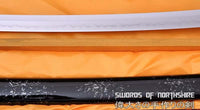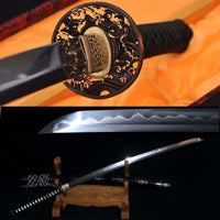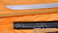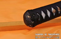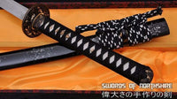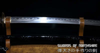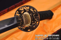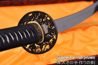 The Gold Wave Katana sword is made of folded and clay tempered steel with a polished mirror-like surface. The blade is very sharp and folded 13 times resulting in 8,192 layers. The visible grain pattern on the blade comes from folding the steel repeatedly during forging. A special clay mixture is applied to the blade by hand, using a thin covering near the edge and a thicker layer over the spine of the blade. This results in a relatively quicker cooling of the edge during quenching, producing a hard edge and softer back. This process also gives the blade it's beautiful hamon (temper line). It is then hand polished with multiple grades of sharpening stones which makes the surface of the blade reflective like a mirror. The blade has a full tang, greatly enhancing the strength of the sword. The sword comes with a black lacquered hardwood saya with paint splatter design, silk sageo/ito, genuine same' (rayskin) and premium copper fittings. This sword is a very good choice for dojo and iaido use, gifts, cutting practice, display, and collection. It is durable enough for tameshigiri and bamboo