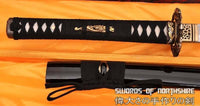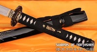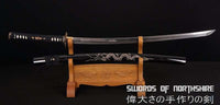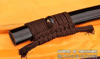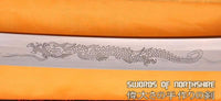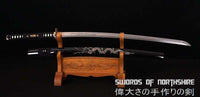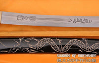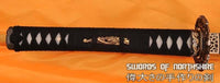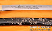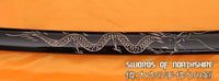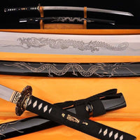 This Katana sword is made of folded and clay tempered steel with a polished mirror-like surface. The blade is very sharp and folded 13 times resulting in 8,192 layers. The visible grain pattern on the blade comes from folding the steel repeatedly during forging. A special clay mixture is applied to the blade by hand, using a thin covering near the edge and a thicker layer over the spine of the blade. This results in a relatively quicker cooling of the edge during quenching, producing a hard edge and softer back. This process also gives the blade it's beautiful hamon (temper line). It is then hand polished with multiple grades of sharpening stones which makes the surface of the blade reflective like a mirror. The blade has a full tang, greatly enhancing the strength of the sword. The sword comes with a black lacquered hardwood saya with a hand carved dragon design, dragon blade engraving, silk sageo/ito, genuine same' (rayskin) and premium engraved copper fittings. This sword is a very good choice for dojo and iaido use, cutting practice, display, and collection. It is durable enough for tameshigiri and bamboo