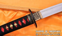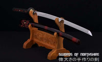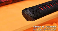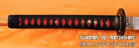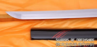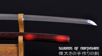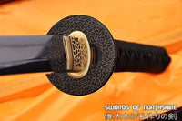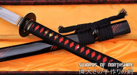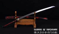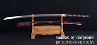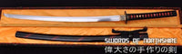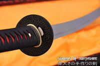 This Katana sword is made of folded and clay tempered steel with a polished mirror-like surface. The blade is very sharp and folded 13 times resulting in 8,192 layers. The visible grain pattern on the blade comes from folding the steel repeatedly during forging. A special clay mixture is applied to the blade by hand, using a thin covering near the edge and a thicker layer over the spine of the blade. This results in a relatively quicker cooling of the edge during quenching, producing a hard edge and softer back. This process also gives the blade it's beautiful hamon (temper line). It is then hand polished with multiple grades of sharpening stones which makes the surface of the blade reflective like a mirror. The blade has a full tang, greatly enhancing the strength of the sword. The sword comes with a black and red lacquered hardwood saya, silk sageo/ito, genuine same' (rayskin) and premium iron fittings. This sword is a very good choice for dojo and iaido use, gifts, cutting practice, display, and collection. It is durable enough for tameshigiri and bamboo