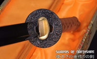 This is a well-made folded steel Ninjato sword, following the traditional Japanese process. The blade is very sharp and folded 13 times resulting in 8,192 layers. The visible grain pattern on the blade comes from folding the blade repeatedly during forging. The blade is then heat-treated, tempered, and oil quenched to achieve optimal levels of flexibility and hardness. Finally, the blade is hand polished with multiple grades of sharpening stones which makes the surface of the blade reflective like a mirror. It comes with a black lacquered hard wood saya and silk sageo/ito, solid alloy fittings, and genuine same (rayskin). The full tang is secured into the handle with two bamboo mekugi. It is a very good choice for Dojo students, gifts, cutting practice, and display. The sword is strong enough to cut through bamboo yet sharp enough to slice paper. Each sword is individually handmade so specifications vary slightly from sword to sword.