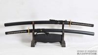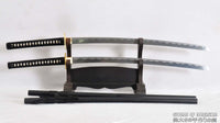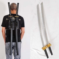 This is a well-made folded steel samurai sword set, made to resemble Deadpool's Katanas. The blade is very sharp and folded 13 times resulting in 8,192 layers. The visible grain pattern on the blade comes from folding the blade repeatedly during forging. The blade is then heat-treated, tempered, and oil quenched to achieve optimal levels of flexibility and hardness. Finally, the blade is hand polished with multiple grades of sharpening stones which makes the surface of the blade reflective like a mirror. It comes with two black matte hardwood sayas, leather backstrap hardness, brass and iron fittings, silk ito, and genuine same (rayskin). The full tang is secured into the handle with two bamboo mekugi. It is a very good choice for Dojo students, gifts, cutting practice, and display. The swords are strong enough to cut through tatami and bamboo. Each sword is individually handmade so specifications vary slightly from sword to sword.